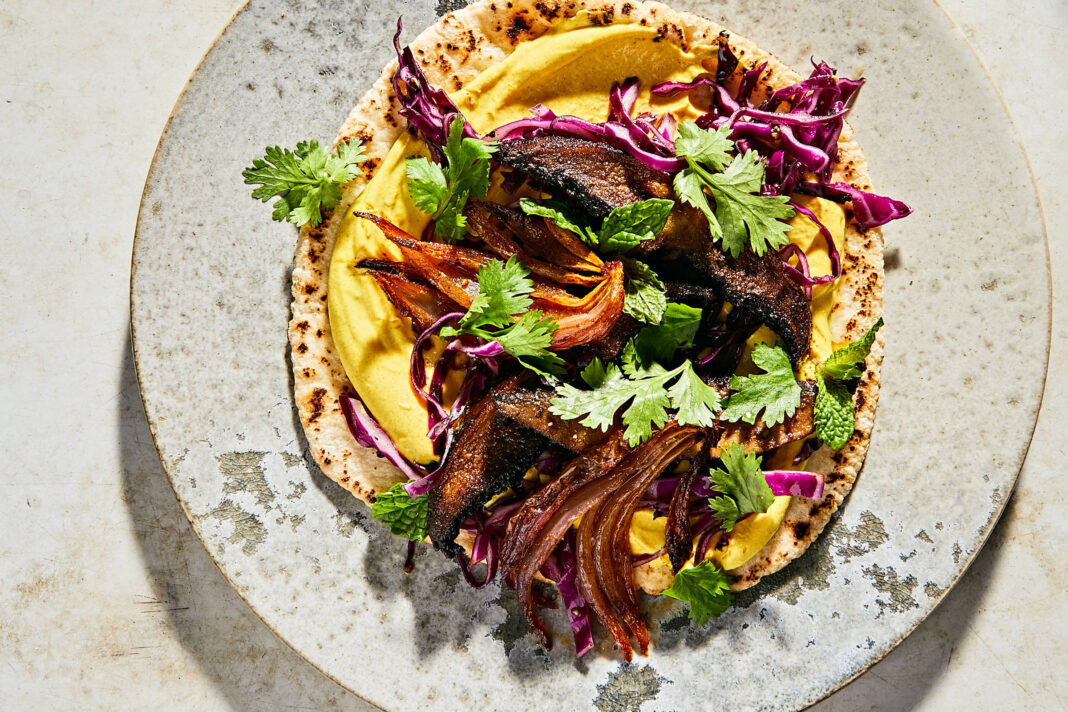 Cogumelos ganham sabor intenso quando polvilhados com especiarias defumadas como cominho, coentro e páprica. Feitos no forno junto a cebola, eles viram recheio para um sanduíche vegetariano tipo shawarma, preparado no Oriente Médio.