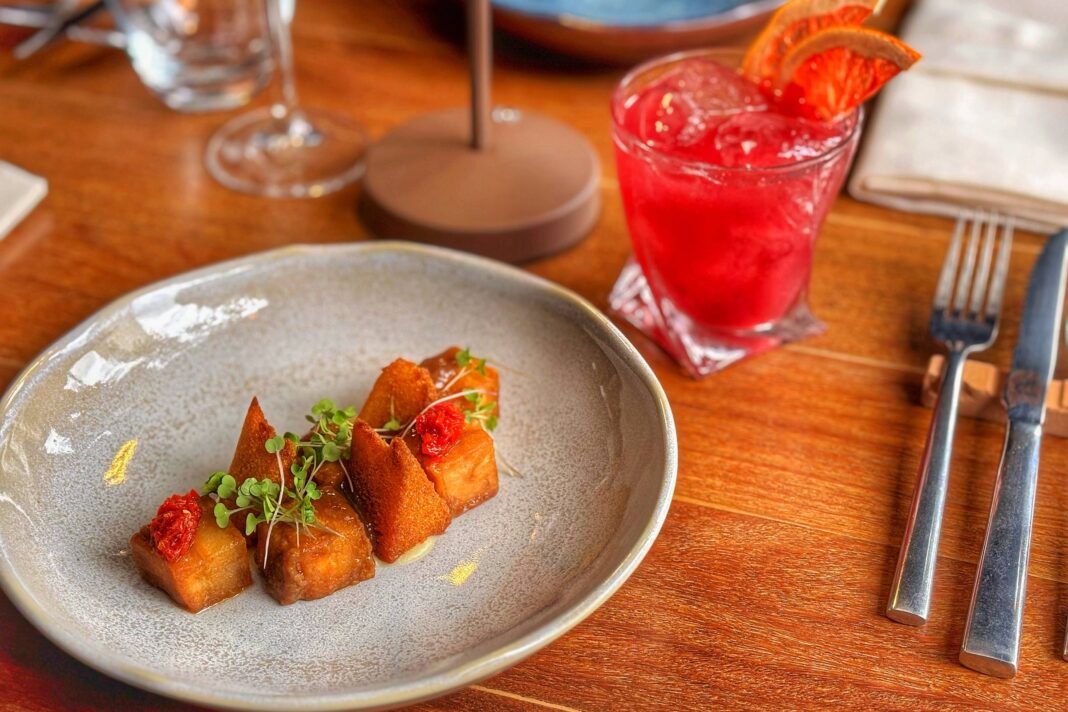 Prato cinza com quatro cubos dourados decorados com microverdes e pedaços vermelhos, sobre mesa de madeira. Ao lado, copo com coquetel vermelho, gelo e fatia de laranja.