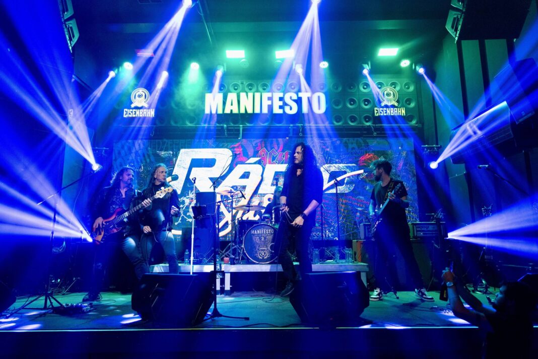 Cinco músicos tocam em palco iluminado por luzes azuis e brancas no Manifesto. O vocalista está ao centro, com guitarristas e baixista ao redor, e bateria ao fundo. O cenário inclui painéis com o nome 'Manifesto' e logotipos da marca 'Desenho'.