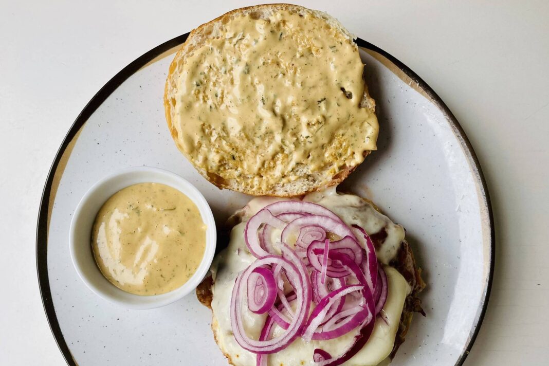 - Monte o sanduíche com o pão besuntado de tucupinese, o hambúrguer e a cebola escorrida