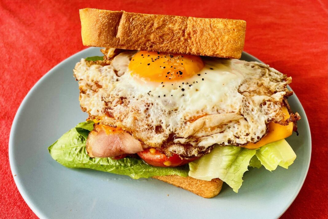 - Monte o sanduíche com uma fatia de pão, a alface, o tomate com um pouco de sal, o bacon, o presunto e o queijo. Frite o ovo na mesma chapa, coloque por cima e cubra com a outra fatia de pão