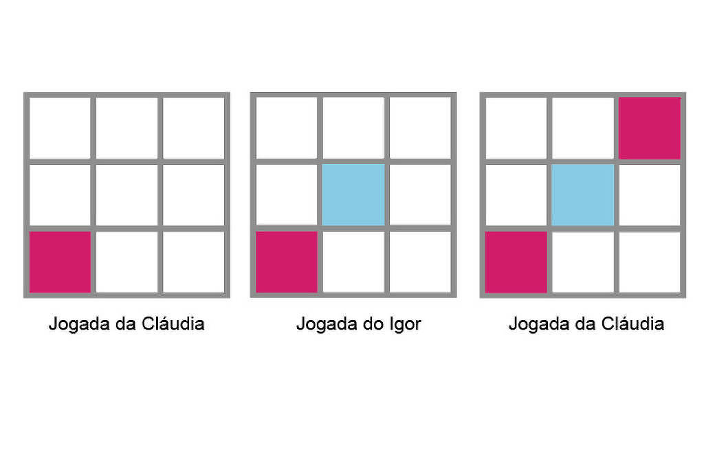 A cada rodada, um participante deve colorir uma casa de azul ou de rosa. Ganha o jogo quem colorir a última casa que completa uma linha, coluna ou diagonal formada por 3 casas da mesma cor.
