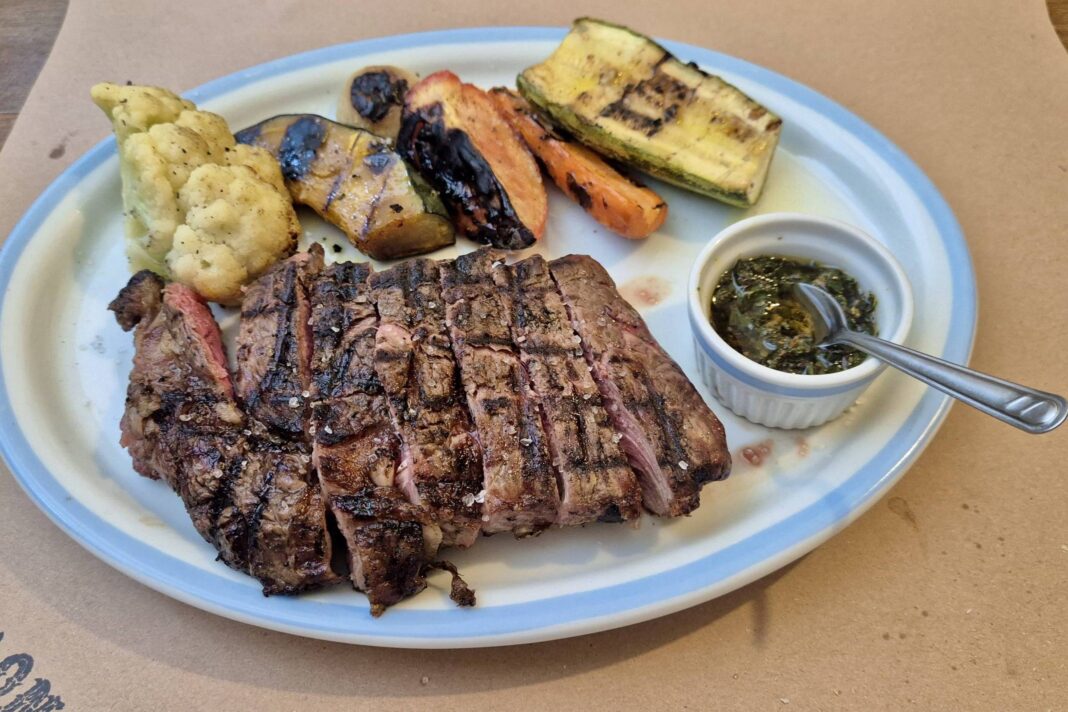 Pouco depois, chegou o certo. O ancho estava macio, no ponto pedido (o da casa, malpassado). Salgado na medida e com a temperatura ideal. O acompanhamento de legumes grelhados veio com abobrinha, abóbora, cebola, cenoura, couve-flor e tomate. Pedindo as empanadas para começar, o prato de carne revelou-se suficiente para duas pessoas.