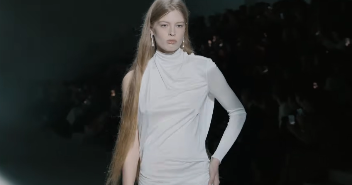 No desfile, assinado pelo diretor criativo Demna, a modelo apresentou o 82º look da coleção de outono/inverno 2026 da marca. Na passarela com estilo futurístico, a modelo desfilou com um vestido branco acetinado, com gola alta, um ombro de fora e costas abertas.
