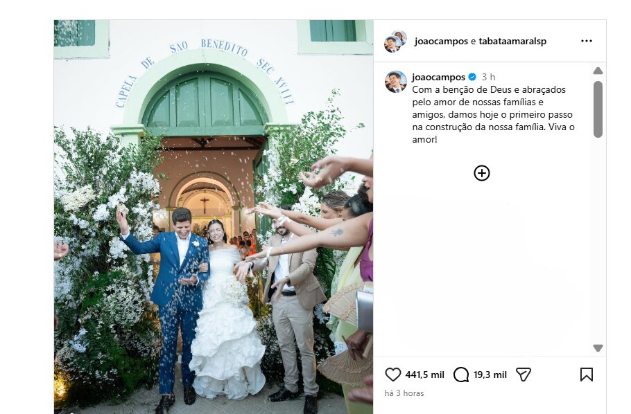 O prefeito do Recife, João Campos (PSB), e a deputada federal Tabata Amaral (PSB-SP) se casaram neste sábado (21) em Pernambuco. O vice-presidente Geraldo Alckmin (PSB) e o ministro Alexandre de Moraes, do Supremo Tribunal Federal (STF), compareceram à cerimônia.
