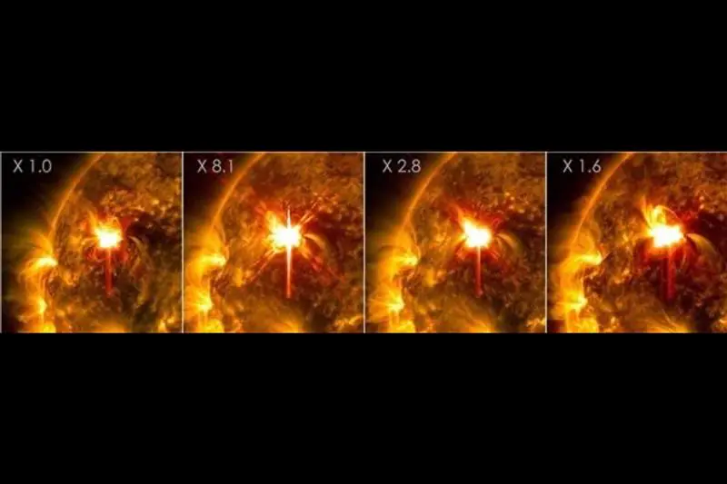 Elas podem afetar as comunicações de rádio, as redes elétricas, os sinais de navegação e representar riscos para espaçonaves e astronautas, segundo o comunicado. As erupções solares observadas nos últimos dias foram classificadas com diferentes graus de intensidade e força: o primeiro clarão foi de X1.0; o segundo de X8.1; o terceiro de X2.8; o quarto clarão de X1.6; enquanto a quinta foi classificada como uma erupção de X1.5.