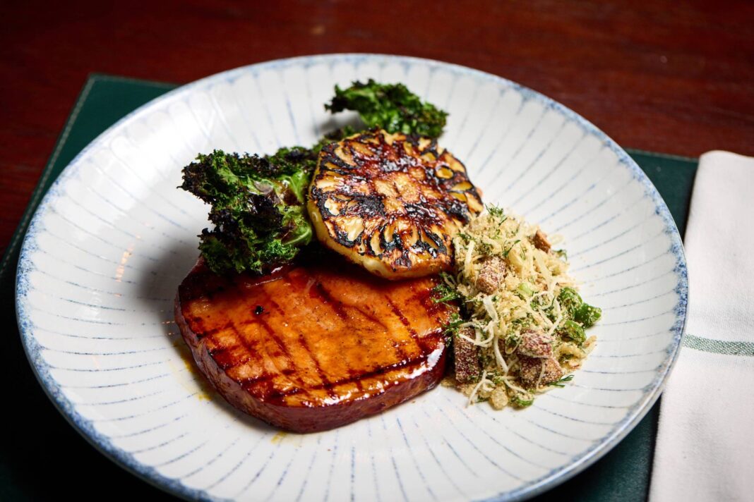 Tender grelhado, com pupunha, abacaxi, farofa de coco e molho de especiarias do restaurante Selvagem