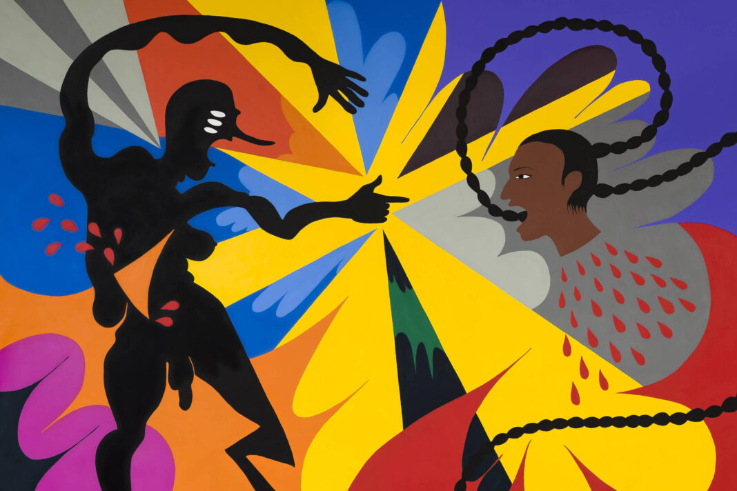 Duas figuras humanas estilizadas em cores vibrantes se enfrentam em um fundo com formas geométricas e cores contrastantes. À esquerda, figura negra com contornos pretos e detalhes vermelhos, em pose dinâmica com braços estendidos. À direita, figura marrom com tranças longas e gotas vermelhas ao redor do pescoço, em expressão de grito. Fundo com formas amarelas, azuis, vermelhas e cinzas, criando sensação de tensão e movimento.