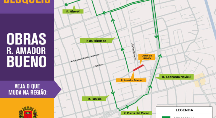 Durante a interdição, motoristas que trafegam pela Rua Amador Bueno deverão utilizar rotas alternativas. Uma das opções é seguir pela Rua da Trindade até a Sebastião Marcos Luiz. Outra alternativa é acessar a Rua Tunísia, passando pela Osíris Del Corso até chegar à Leonardo Novicki.