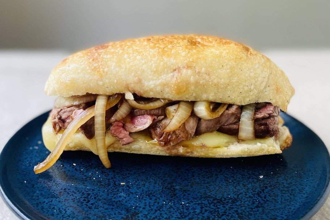 - Fatie a carne e tempere com sal e pimenta. Monte o sanduíche com a carne fatiada e a cebola