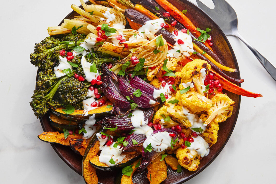 Uma travessa grande de legumes assados coloridos é o acompanhamento perfeito para festas —e você pode prepará-la com antecedência. Os legumes podem ser cortados no dia anterior e guardados na geladeira. Asse-os algumas horas antes de servir e reaqueça por 7 a 15 minutos em forno preaquecido a 180°C a 200°C, ou sirva em temperatura ambiente. Finalize com sementes, ervas frescas, iogurte com alho e mel picante —o sabor vai brilhar.
