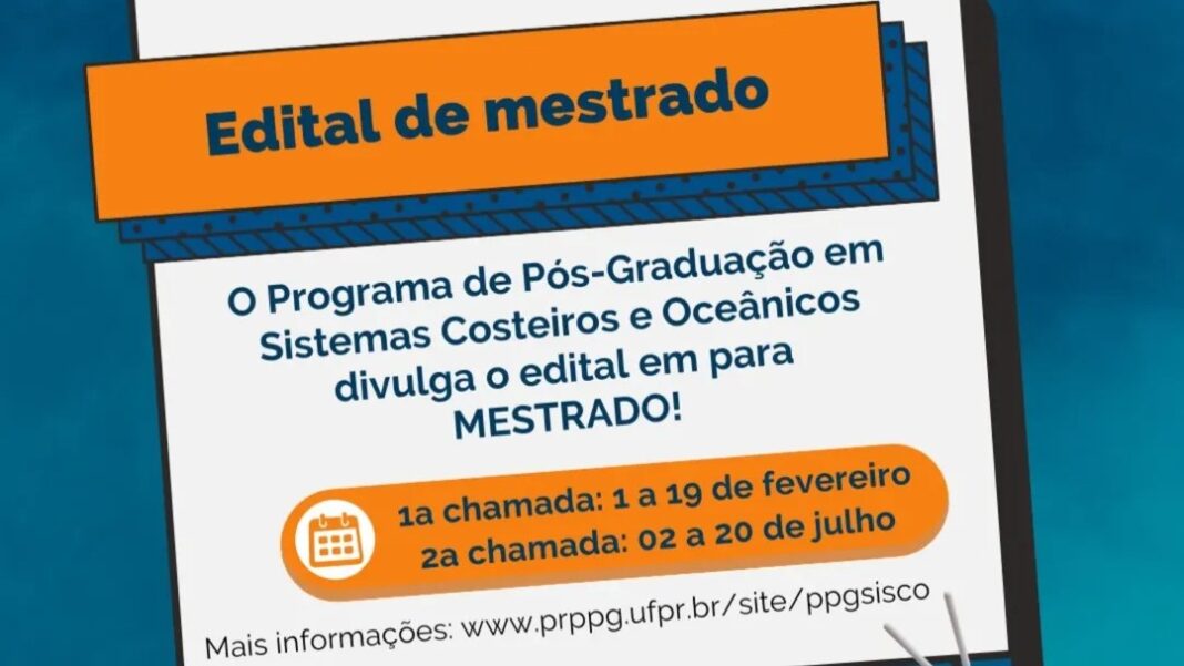 A coordenação do Programa de Pós-Graduação em Sistemas Costeiros e Oceânicos (PPGSISCO) divulgou na última sexta-feira (16) o edital para o processo seletivo para o seu curso de mestrado. Ao todo, são ofertadas 52 vagas, distribuídas entre as linhas de pesquisa do Programa, de acordo com a disponibilidade dos orientadores. Desse total, 20% são reservadas para ações afirmativas.