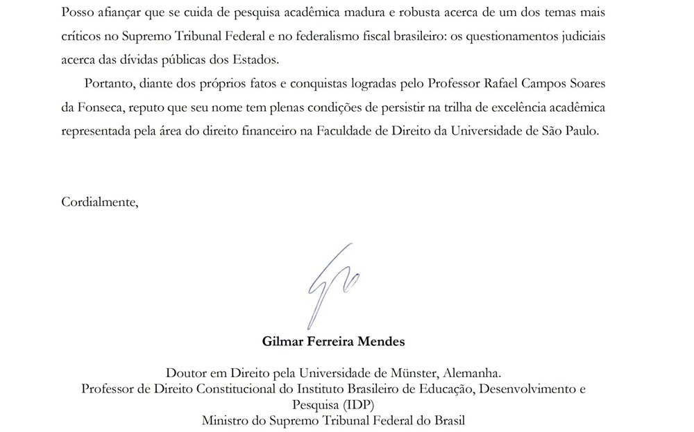 O caso tem gerado controvérsia na comunidade acadêmica há mais de um ano. Fonseca anexou ao seu memorial — documento que serve de base para a avaliação curricular dos concorrentes — diversas cartas de recomendação de autoridades do alto escalão do Judiciário brasileiro.